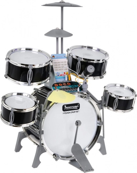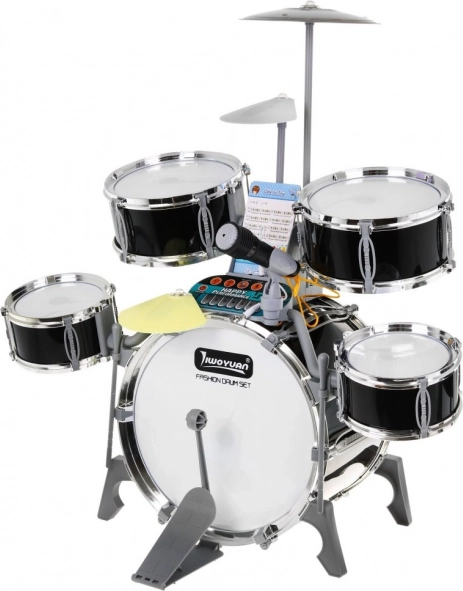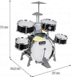 Multifunkční dětský bicí set obsahuje 5 bubnů, 2 elektronické talíře (plastové) a jeden kovový talíř, ovládací panel, mikrofon, 2 paličky a 6 karet s notami pro snadnou výuku hry. Set je napájen třemi AA bateriemi nebo USB kabelem.