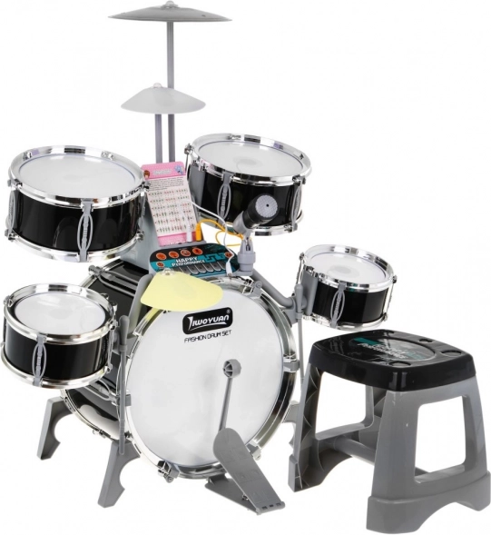 Bubnový set zahrnuje všechny nezbytné součásti pro hraní: bubny různé velikosti, mikrofon, paličky i malý stoleček.