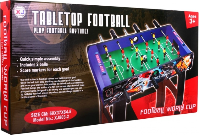 Stolní fotbálek je vyroben z MDF materiálu pokrytého odolným laminátem, který zajišťuje pevnost a odolnost celé konstrukce.