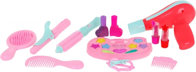- Bohatá výbava: 10 očních stínů, štěteček, hřeben, kartáč, žehlička, kulma, 2 sponky, 2 rtěnky, 2 „lakování“ a další.