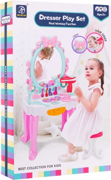Rozmazlete malou princeznu stylovým kosmetickým stolkem pro děti od 3 let. Toaletka nabízí světelné efekty, hudební podkres a funkční dětský fén s foukáním. Součástí je stolička, bohaté příslušenství pro kadeřnické a líčicí hry a výsuvná zásuvka pro uložení pokladů. Zábava a rozvoj fantazie na každý den.