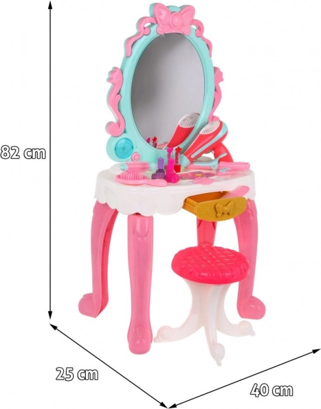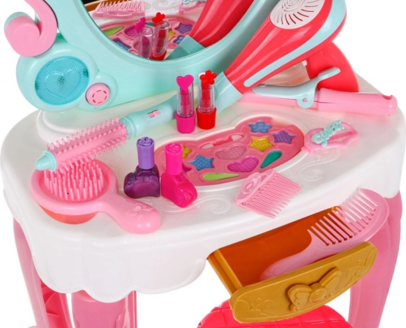 Dětská toaletka s bohatou výbavou promění pokoj v malé kosmetické studio. Zrcadlo se světly nahoře i po stranách, tři melodie a skutečně foukající dětský fén vytvoří autentickou atmosféru salonu. Toaletka je napájena 5× AA bateriemi (nejsou součástí balení).