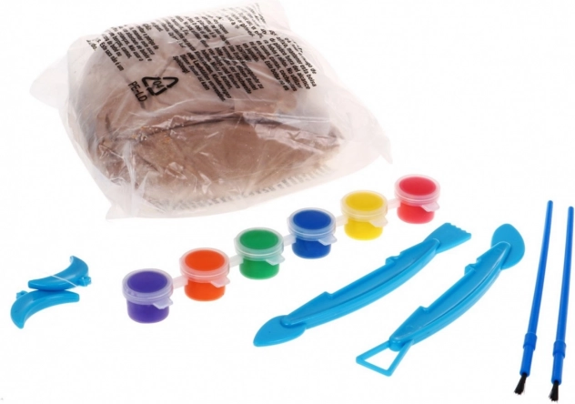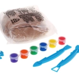 Vše, co děti potřebují: 800 g hlíny, 6 barev, 2 štětce, 2 sochařská nářadí, řezací struna s úchyty a praktický stojan.