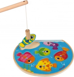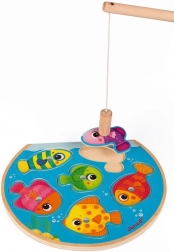 Zábavná dřevěná magnetická vkládačka pro malé rybáře. Pomocí magnetické udičky děti loví a vracejí dílky na správná místa. Obsahuje 6 barevných rybiček a 1 udičku, rozvíjí jemnou motoriku, koordinaci oko–ruka i poznávání barev a tvarů. Vhodné od 12 měsíců.