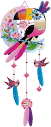 Lapač snů (10 pírek, růžová šňůrka, motiv ptáčka); Origami girlanda (25 listů origami papíru, růžová šňůrka); 3 karty s třpytkami a flitry; 3 mozaikové karty s pěnovými dílky; 3 vyškrabovací masky a dřevěná škrabka