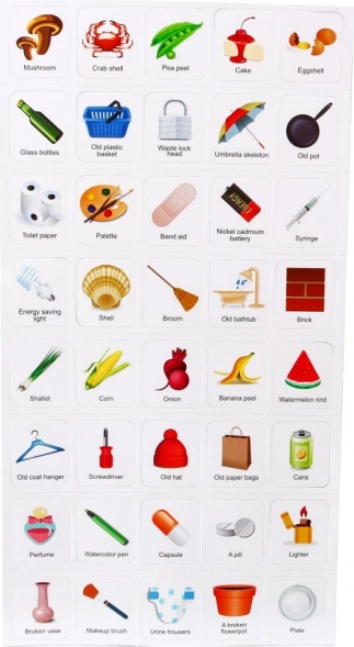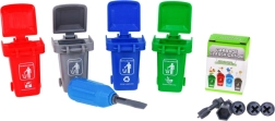 Součástí sady je obrázková kartičková příručka, která vysvětluje, jak správně třídit odpad: zelený – kuchyňský/bio odpad, modrý – recyklovatelný odpad, šedý – směsný odpad, červený – nebezpečný odpad. Díky tomu si děti přirozeně osvojí ekologické návyky a zodpovědnost k prostředí.