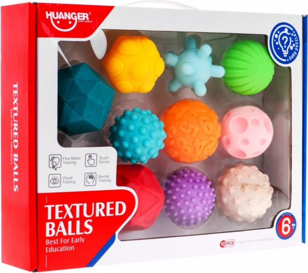Tato univerzální sada obsahuje 10 měkkých gumových míčků s odlišnými povrchy a tvary, ideálních pro miminka od 6 měsíců i starší děti. Různorodé textury podporují hmatové vnímání, posilují prsty a dlaně a pomáhají rozvíjet koordinaci ruka–oko. Při stisku míčky příjemně pískají, což stimuluje sluch a udržuje pozornost.