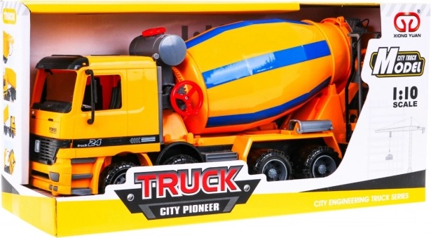 Tato plastová míchačka betonu je věrným zmenšeným modelem skutečného stavebního vozu. Děti si zamilují funkční prvky, jako je otočný buben ovládaný boční kličkou, zadní násypka pro doplňování „betonu“ a otočná výsypná rynna pro realistickou hru na stavbě.