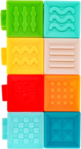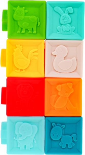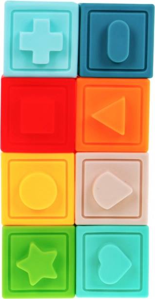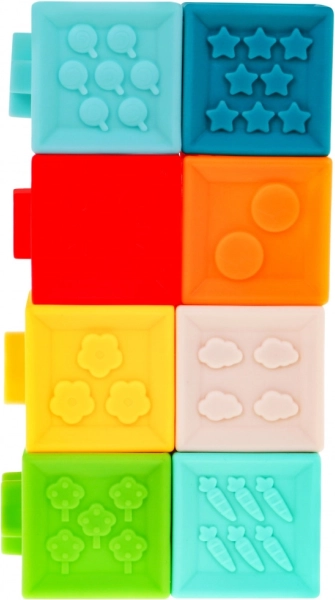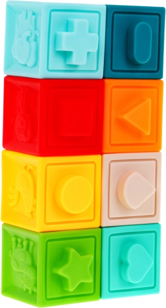 Barevné kostky s embosovanými tvary a zvířátky lákají ke stohování, rozvoji koordinace a rané kognice formou hry.