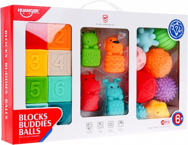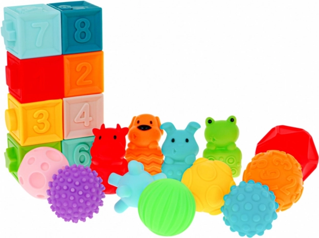 Mega sada 20 smyslových míčků, kostek a zvířátek pro děti 6m+