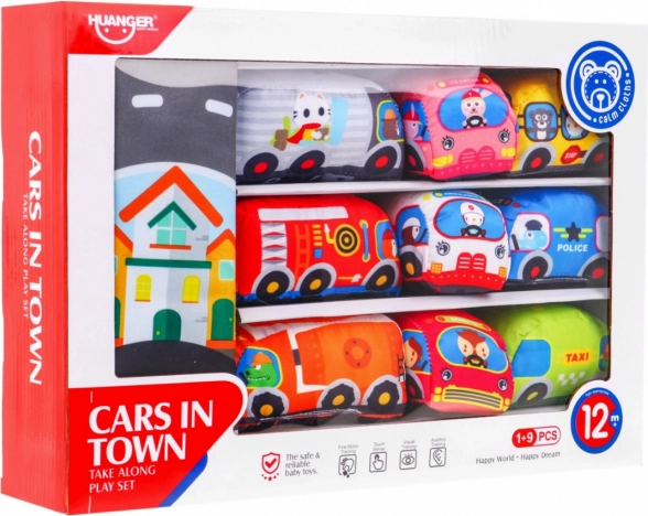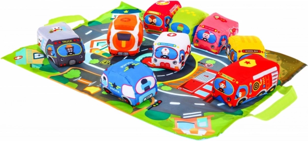 Tato univerzální sada podporuje kreativitu a imaginativní hru dětí od 12 měsíců. Devět barevných vozidel – například školní autobus, hasičské auto, sanitka, taxi, policejní vůz, míchačka, nákladní auto, zmrzlinář a donut truck – láká k objevování města vytištěného na měkké podložce.
