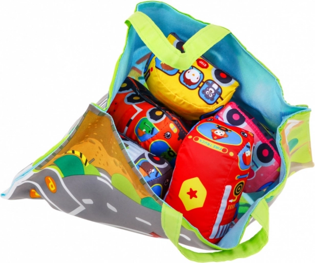 Autíčka jsou z měkkého textilního materiálu a díky různým zvukům (šustění, cinkání, pískání) rozvíjejí jemnou motoriku, sluchové vnímání i koordinaci oko–ruka. Podložka se dá složit do praktické tašky s uchy pro snadné uložení i přenášení a je ideální pro hraní doma i na cestách.