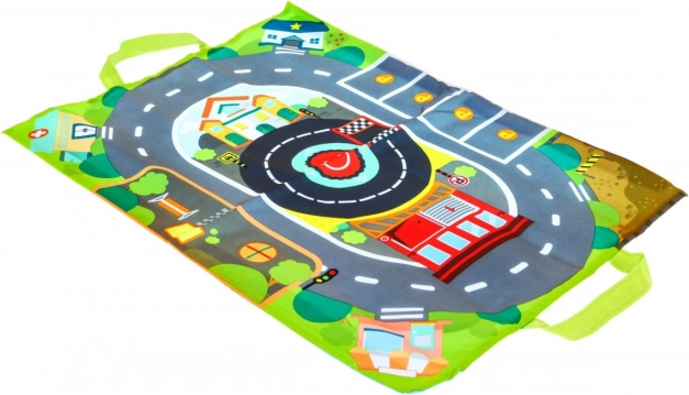 Podložka s cestami, domky a přírodou se díky suchým zipům složí do praktické tašky s uchy. Snadné uložení a přenášení kamkoli.
