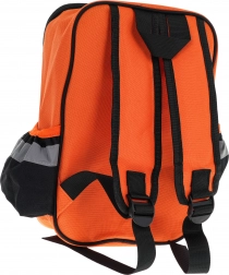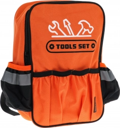 Lehký textilní batoh s hlavní komorou na zip, vnějšími kapsami a reflexními prvky udrží nářadí přehledně a bezpečně na jednom místě.