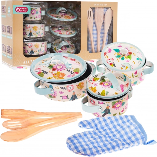 Dětská sada hliníkových hrnců s kuchyňskými doplňky je ideální pro malé kuchaře od 3 let. Obsahuje 10 dílů, včetně hrnců a chňapky, pro realistické hraní na kuchaře.