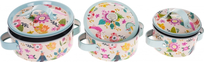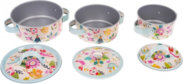 Sada obsahuje tři hliníkové hrnce s poklicemi, dokonale se hodící pro různé hry na vaření.