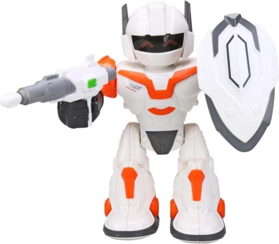 Zábavný robot na baterie vysoký 20 cm se postará o akční podívanou: chodí, má světelné a zvukové efekty, otáčí se o 360° a v rukou drží zbraň a štít.