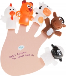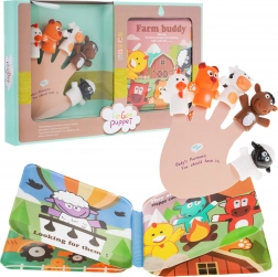 Zábavná sada pro děti od 3 let: 5 gumových prstových maňásků (slepička, pejsek, oslík, kravička, beránek) a měkká voděodolná knížka s pískátkem. Ideální pro divadélko, rozvoj fantazie a jemné motoriky. Bezpečné provedení bez ostrých hran, texty v knížce jsou v angličtině.