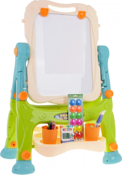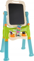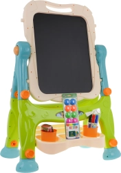 Tato kreativní sada spojuje magnetickou bílou tabuli pro psaní fixy a připevňování magnetů s černou křídovou plochou pro klasické kreslení. Tabule se otáčí o 360°, má zaoblené hrany pro bezpečné používání a díky výměnným delším a kratším nohám ji snadno přizpůsobíte aktuální výšce dítěte. Praktická polička udrží všechny potřeby po ruce a integrované klipsy umožní malovat i na papír.