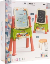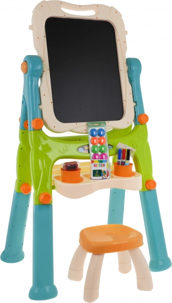 - Tabule 2v1, výměnné nohy, police, taburet, 2 plastové kelímky, 3 mazatelné fixy, 12 kříd, držák na křídu, 12 magnetů, magnetická houbička, 2 klipsy, šrouby