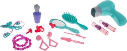 Součástí je bezpečný fén na 1× AA baterii, který jemně fouká a vydává realistické zvuky – ideální pro hru na kadeřnický salón.