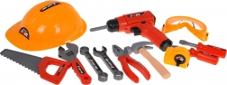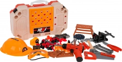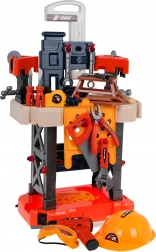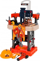 Součástí je široká paleta plastových nástrojů (pila, kladivo, kleště, šroubováky, klíče), svěrák, ozubená kola, spojovací materiál a ochranné vybavení (brýle, helma). Děti tak bezpečně trénují jemnou motoriku, koordinaci oko–ruka a logické myšlení, zatímco si užívají zábavné předstírané dílenské práce.