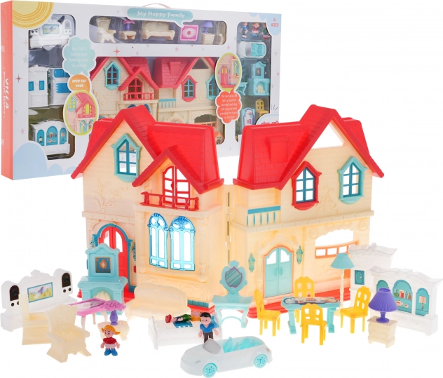 Součástí je bohatý set příslušenství: nábytek do obýváku, ložnice i kuchyně, dekorace, auto s pohyblivými koly a tři figurky (maminka, tatínek, dítě). Díky snadnému rozkládání a otevíracím dveřím je hraní přehledné a pohodlné.