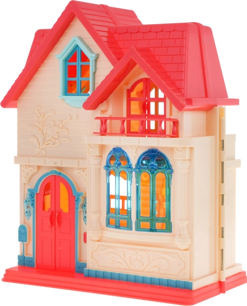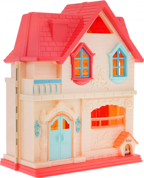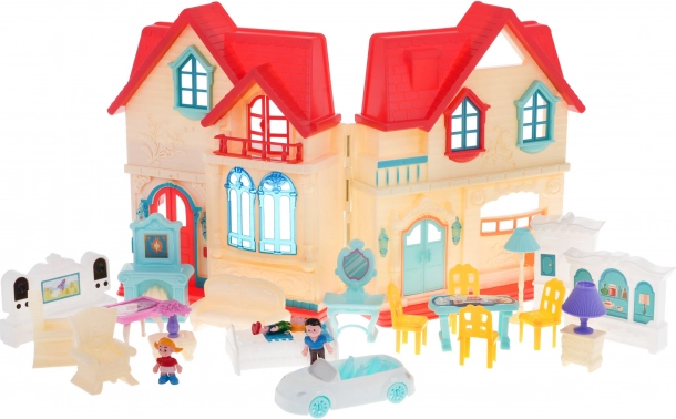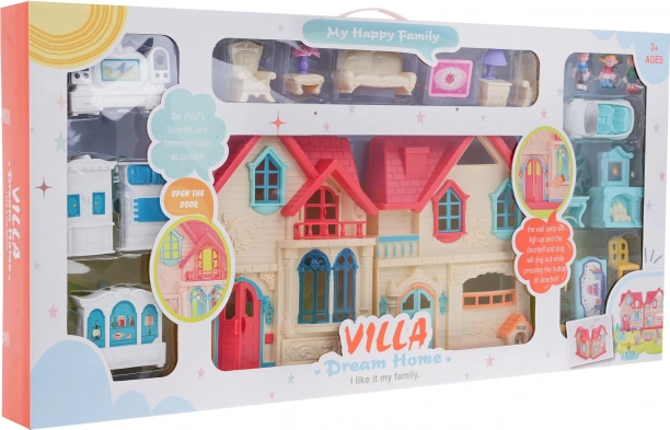 Tato barevná rozkládací vila nabízí dětem od 3 let nekonečné možnosti hry. Po otevření získáte přístup do čtyř detailně vybavených pokojů s nábytkem a doplňky. Zvonek u vstupních dveří po stisknutí zahraje zvuk zvonění a štěkání pejska a současně rozsvítí lampy u dveří, v místnosti navíc bliká stojací lampa.
