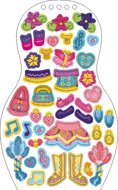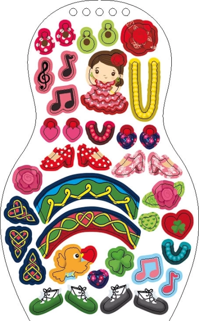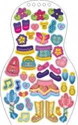 Boty, sukně, hudební noty a květy – plastické samolepky na bílém podkladu pomohou dětem snadno vytvářet originální kostýmy.