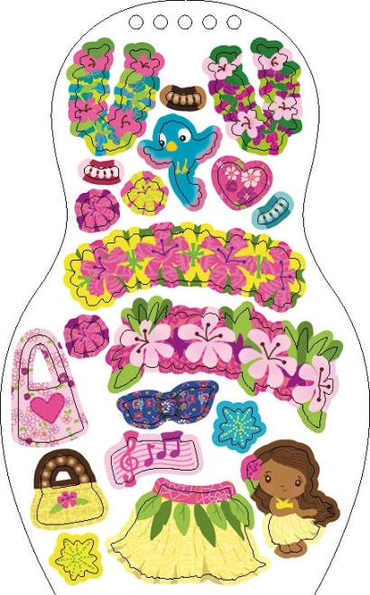 Arch samolepek s květinami, notami, ptáčky a taneční postavičkou v hula sukni přinese exotickou atmosféru a barevné kombinace, které děti milují.
