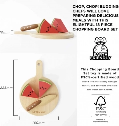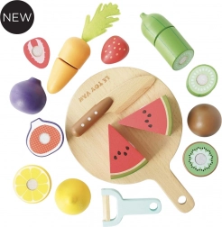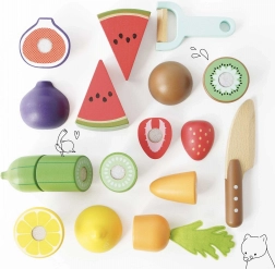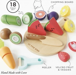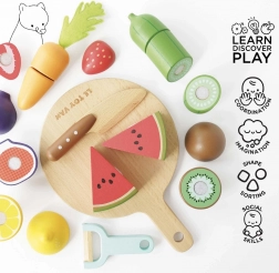 Tato kvalitní sada pro malé kuchaře přináší realistickou hru plnou fantazie. Obsahuje přírodní dřevěné prkénko, škrabku, nůž a výběr chutně vypadajících potravin, které lze pomocí suchého zipu snadno „nakrájet“ a znovu spojit. Ideální pro rozvoj koordinačních schopností, jemné motoriky i role-play.