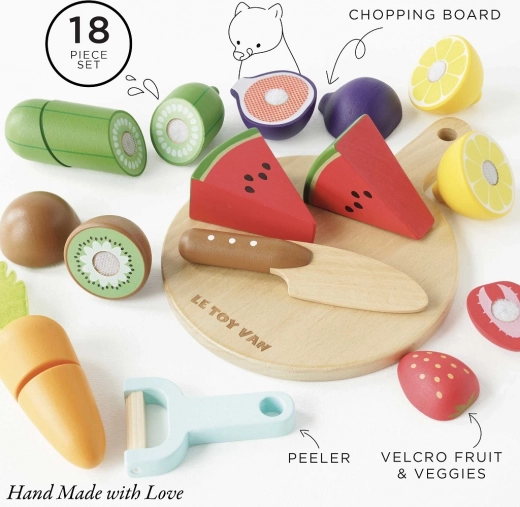 Dřevěná 18dílná sada Le Toy Van: krájecí ovoce a zelenina na suchý zip. FSC dřevo, netoxické barvy, rozvoj motoriky. Skvělá hračka od 2 let.