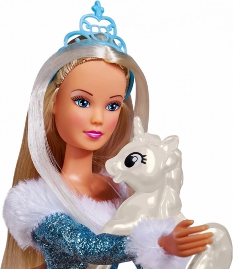 Třpytivé modro-bílé šaty se sněhovými motivy, korunka a stylové detaily promění Steffi v opravdovou zimní princeznu.
