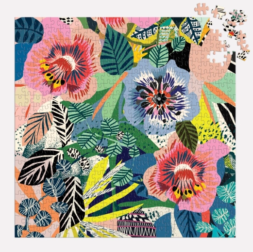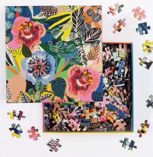 Energií pulzující květinová ilustrace v sytých barvách promění hotové puzzle v dekorativní obraz vhodný k zarámování.