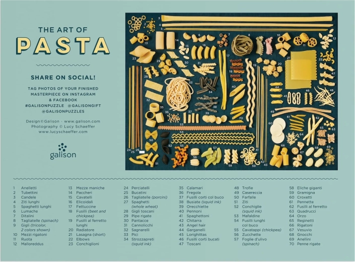 Vychutnejte si kreativní relax s puzzle GALISON Umění těstovin. Díky tematickým prvkům a originálnímu designu si skládání užijí začátečníci i zkušení puzzlisté. Součástí balení je přehledná předloha, která vám pomůže krok za krokem.