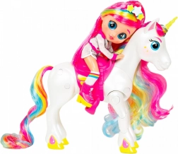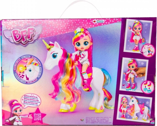 Jednorožec Rym po stisknutí hlavičky svítí a přehrává až 6 různých zvuků, panenka má kloubové tělo pro realistické pózování a set je nabitý módními doplňky – kabelkou, náhrdelníkem BFF, čepicí a dalšími překvapeními.