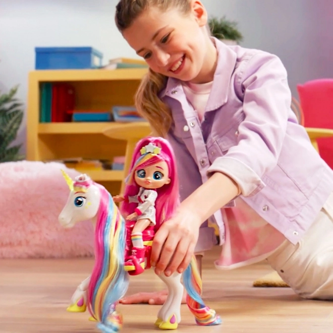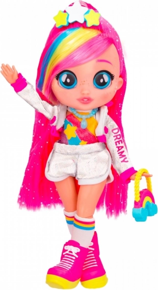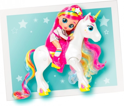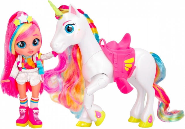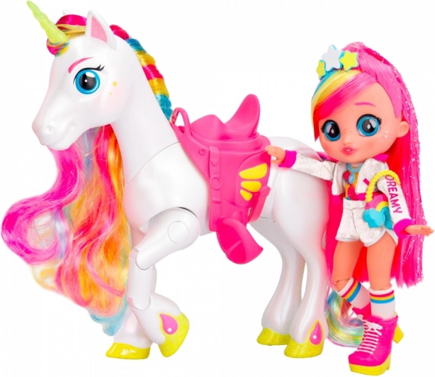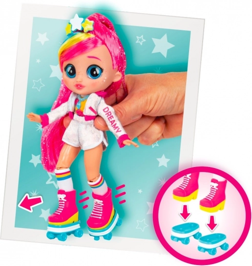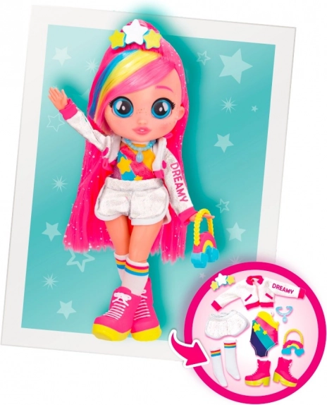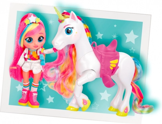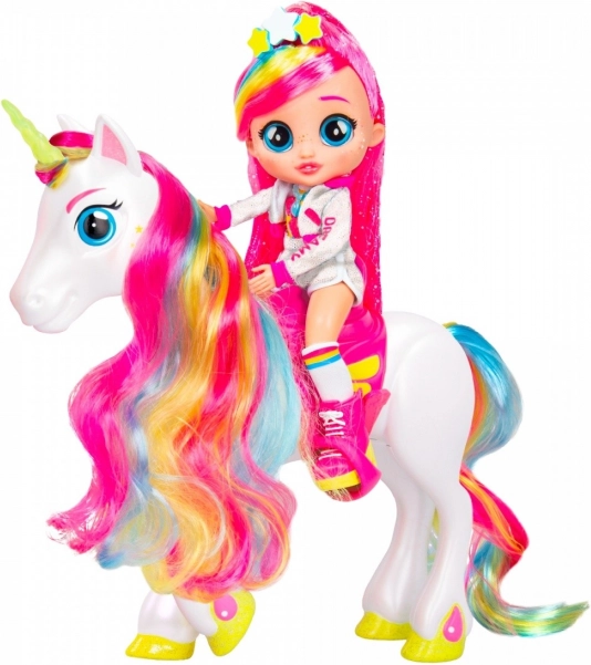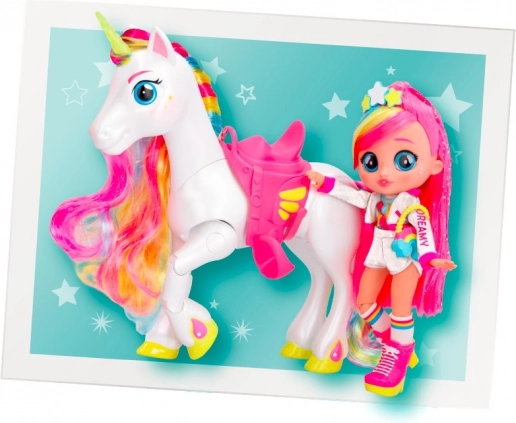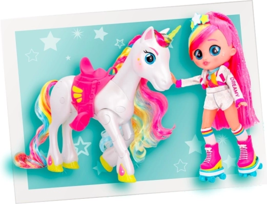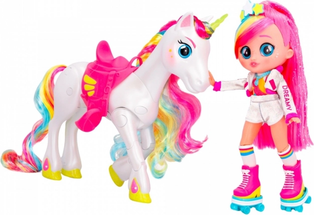 Set CRY BABIES BFF Dreamy & Rym přináší dětem hodinovou porci zábavy v zářivých barvách duhy. Dreamy s růžovými vlasy a trendy outfit doplňuje kouzelný jednorožec Rym s pohyblivými nohami a efekty na rohu. Balení zároveň slouží jako stylová garderoba, která podporuje organizaci doplňků a hraní příběhů.