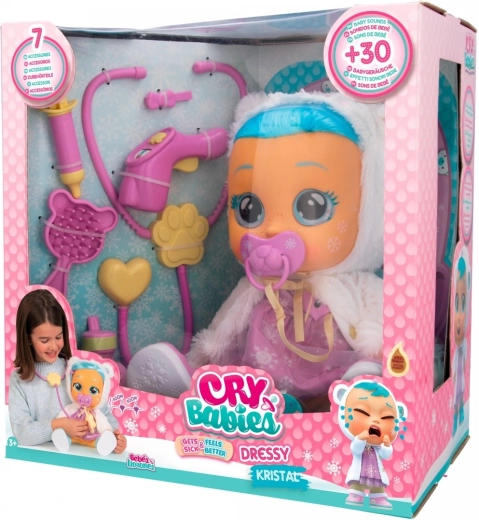 Seznamte se s Cry Babies Kristal v jejím elegantním oblečení! Tato interaktivní hračka pláče opravdovými slzami a vydává autentické zvuky plačícího miminka, což poskytuje zábavnou péči pro děti.