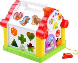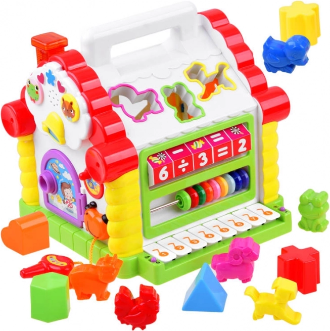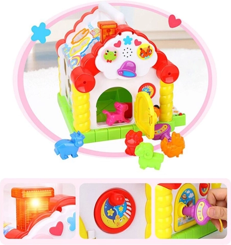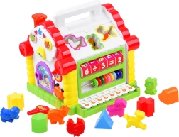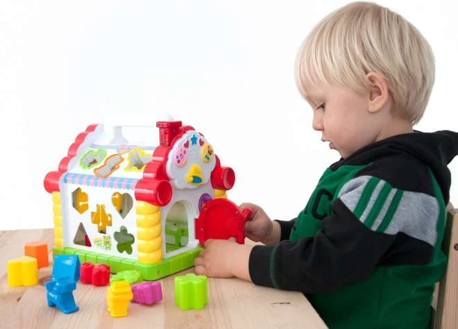 Domeček umožňuje dětem vložit různé tvary a zvířátka do správných otvorů, což stimuluje jejich jemnou motoriku a poznávání tvarů a zvuků.