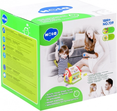 - Prostor pro vkládání tvarů: Na střeše domečku jsou otvory pro vkládání tvarů a zvířátek, které po správném umístění hrají zvuky.