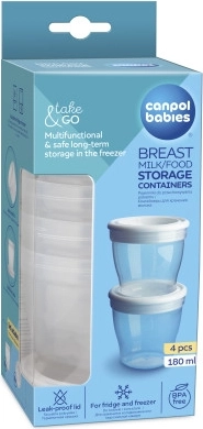 Praktická sada od CANPOL BABIES pro bezpečné uchovávání dětských pokrmů a mateřského mléka. Zásobníky o objemu 180 ml jsou vhodné do ledničky i mrazničky, mají těsnící šroubovací víčko, stohovatelné provedení a objemovou stupnici pro snadné dávkování. Ideální pro mléko, polévky, kaše i ovocno-zeleninové příkrmy.