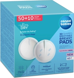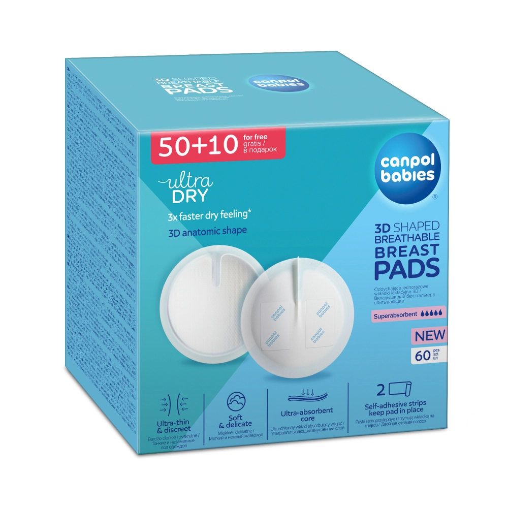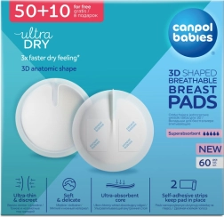 Jednorázové prsní vložky Canpol babies s 3D anatomickým tvarem jsou ideální pro těhotné a kojící maminky. Nabízejí ultraabsorpční jádro, prodyšnou a měkkou vrchní vrstvu a nepropustnou spodní bariéru, která chrání prádlo před promočením. Díky 2 lepicím proužkům drží spolehlivě na místě, jsou velmi tenké (1,3 mm), diskrétní a poskytují rychlý pocit sucha. Balení obsahuje 60 kusů (50 + 10 zdarma).