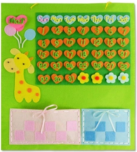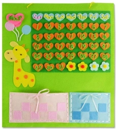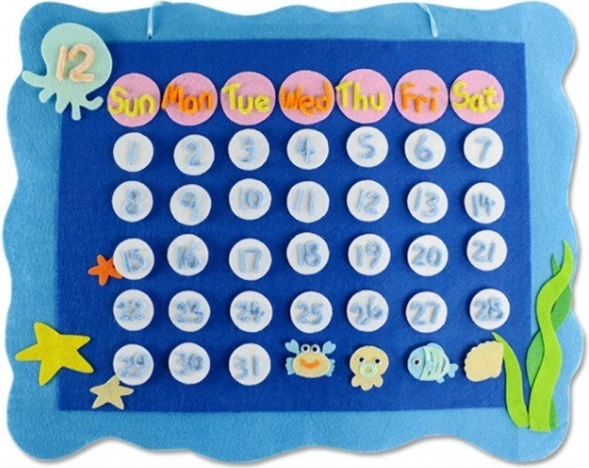 Dětský filcový kalendář s přehlednými dny v týdnu a čísly podporuje poznávání času a každodenní rutiny formou hry.