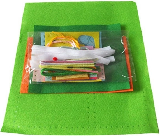 Sada obsahuje barevné textilní díly, ozdoby, stuhu i velkou plastovou jehlu. Děti mohou okamžitě začít tvořit bez dalších dokupů.