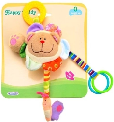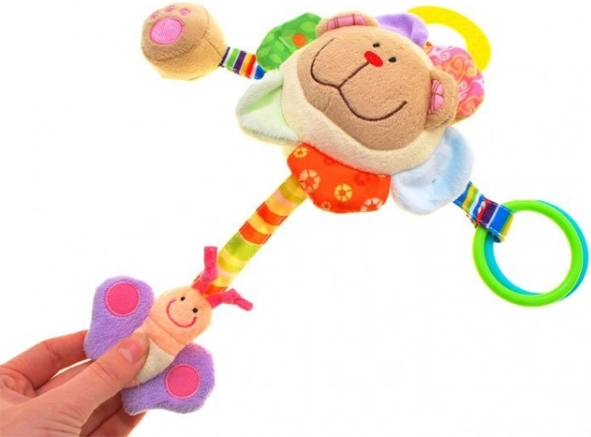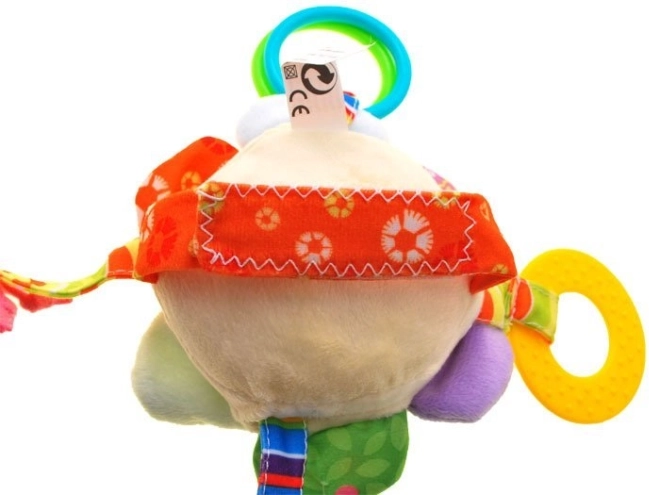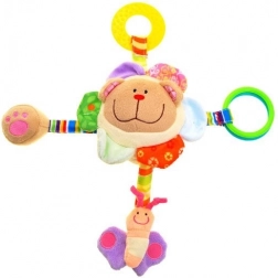 Uvnitř hlavičky je chrastící kulička, která při zatřesení vydává jemný zvuk, ideální pro upoutání pozornosti a povzbuzování k pohybu. Závěska obsahuje čtyři barevné stuhy s různými hracími prvky: