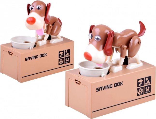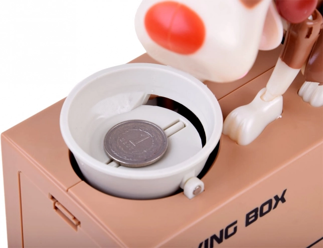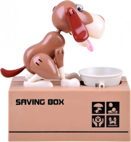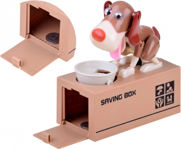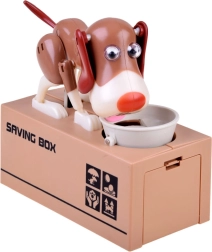 Vhozíte minci do misky před psem. Pes se začne pohybovat, jako by jedl potravu z misky, což způsobí, že mince spadne do pokladničky. Pes se při tom vesele pohybuje a třese ušima. K provozu potřebujete 3 baterie. Pokladnička pomůže dětem pochopit, že šetření je nejen zábavné, ale přináší také pozitivní výsledky.