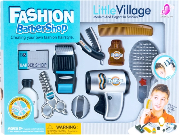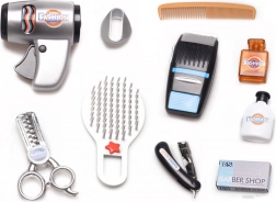 Souprava zahrnuje všechny potřebné nástroje pro hru na kadeřnictví, od stříhacích nůžek po lahve šamponu a kolínské.