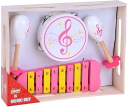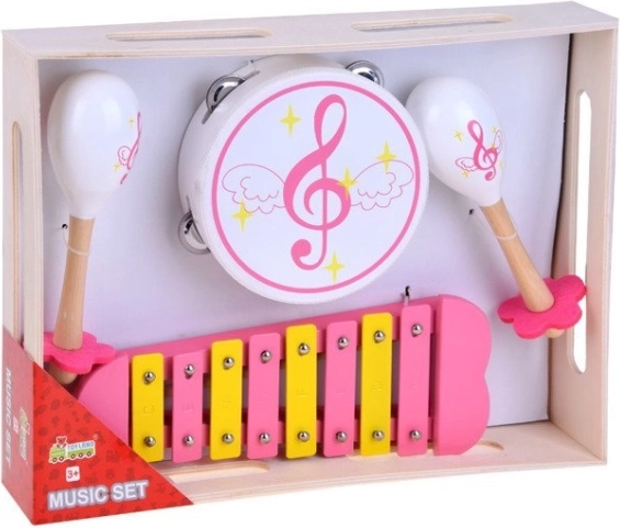 Tato víceprvková hudební sada je perfektní volbou pro malé muzikanty i celou partu kamarádů. Nástroje jsou vyrobené z kvalitního dřeva, mají příjemný zvuk a lákavý design v růžových a žlutých tónech. Děti si díky nim přirozeně osvojí rytmus, koordinaci a cit pro hudbu.