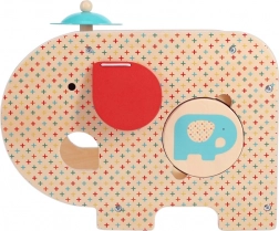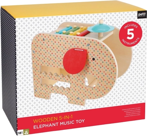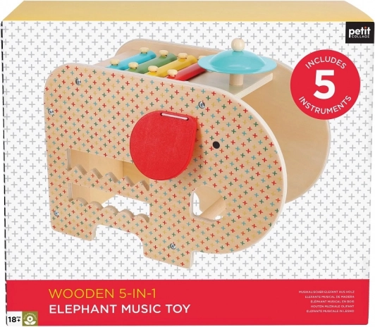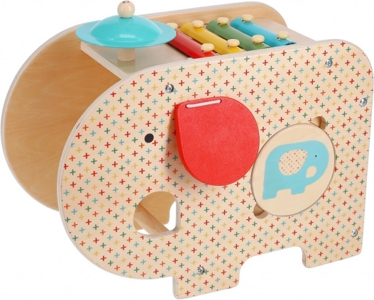 Seznamte své ratolesti s rytmem a zvukem díky tomuto všestrannému dřevěnému slonovi. Obsahuje pět různých herních možností, jako je hraní na xylofon, bubínek, činel a další.