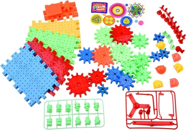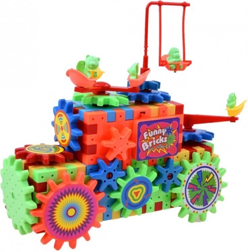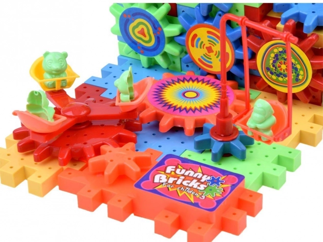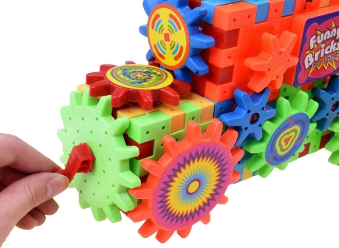 Set obsahuje ozubené kolečko napájené baterií AA, které děti mohou použít k oživení staveb.